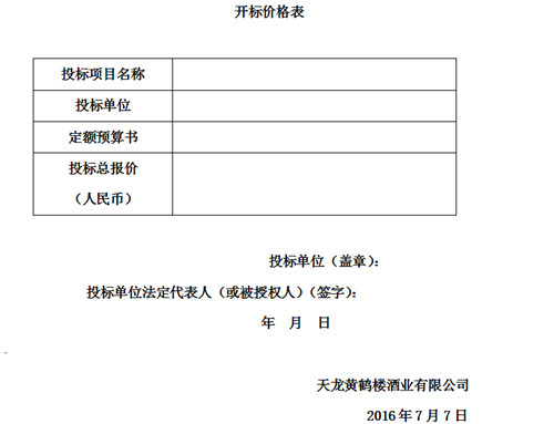 六、開標、評標、定標:由天龍黃鶴樓酒業有限公司另行通知。
