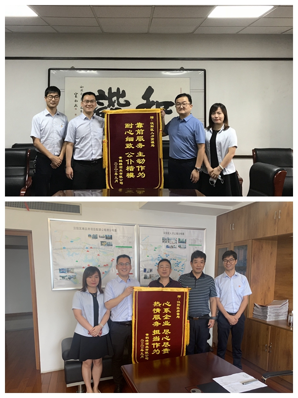 9月11日,公司人力資源中心總監助理張佳一行分別前往漢陽區人力資源局、漢陽區房管局贈送錦旗,對兩家局機關長期以來在政策服務、問題協調等方面給予的支持表達感謝。漢陽區人力資源局就業局局長王鏑,漢陽區房管局黨組成員、副局長張偉龍及辦公室主任劉敏分別作為代表接收錦旗。
