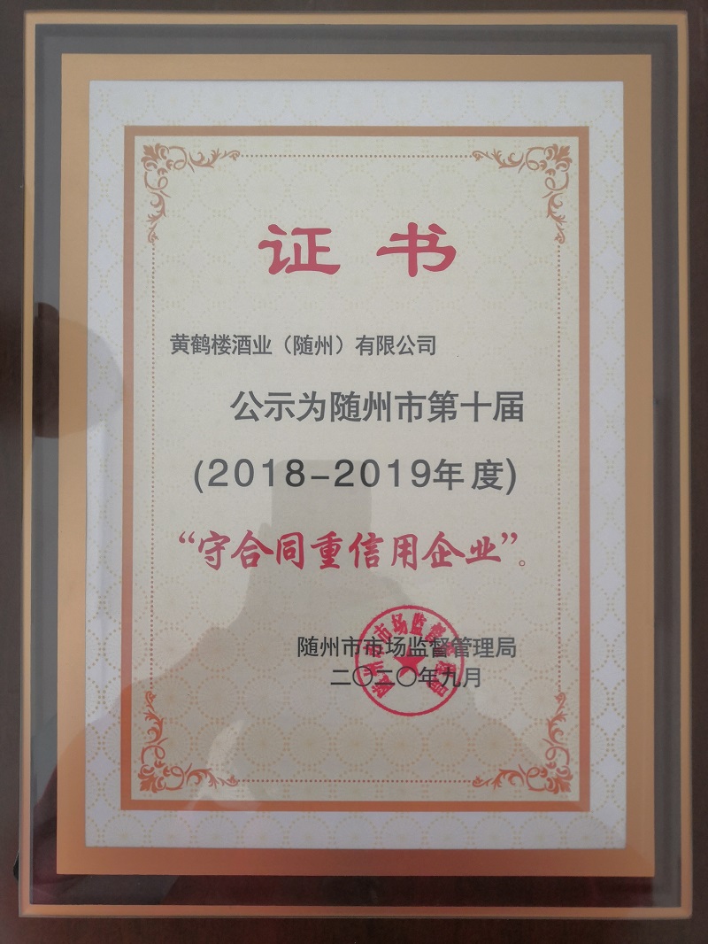 11月4日,隨州市市場監督管理局授予黃鶴樓酒業(隨州)有限公司隨州市第十屆“守合同重信用”企業榮譽稱號并發放證書,代授湖北省第十五屆“守合同重信用”企業榮譽證書。