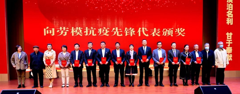 (許鵬(右七)、魏國(guó)(右三)被授予“勞模抗疫先鋒”稱號(hào))