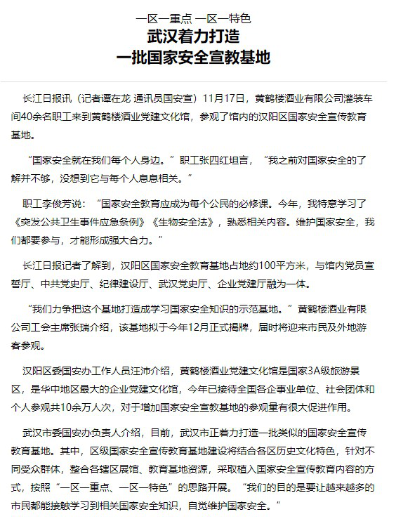 ? ? ? ?近日,黃鶴樓酒業(yè)黨建文化館內的漢陽區(qū)國家安全宣傳教育基地榮登長江日報。