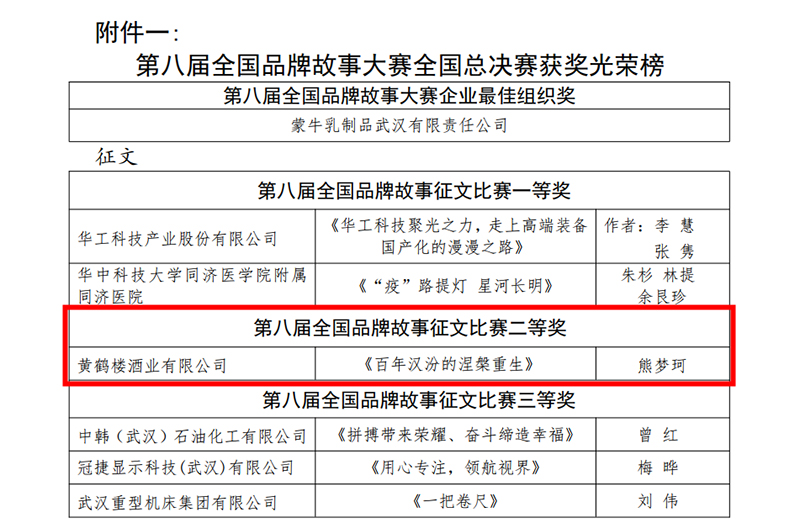 近日,黃鶴樓酒業在第八屆全國品牌故事大賽與質量管理小組活動中取得優秀成績。作品《百年漢汾的涅槃重生》榮獲“第八屆全國品牌故事大賽征文比賽二等獎”和“武漢賽區征文比賽二等獎”。