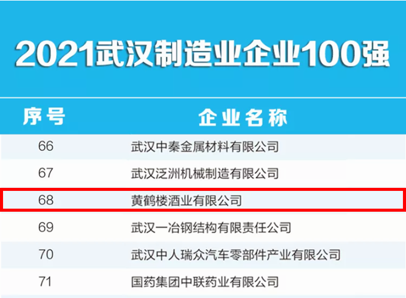 8月23日,2021年武漢企業100強榜單發布,黃鶴樓酒業榮登2021武漢制造業企業100強。