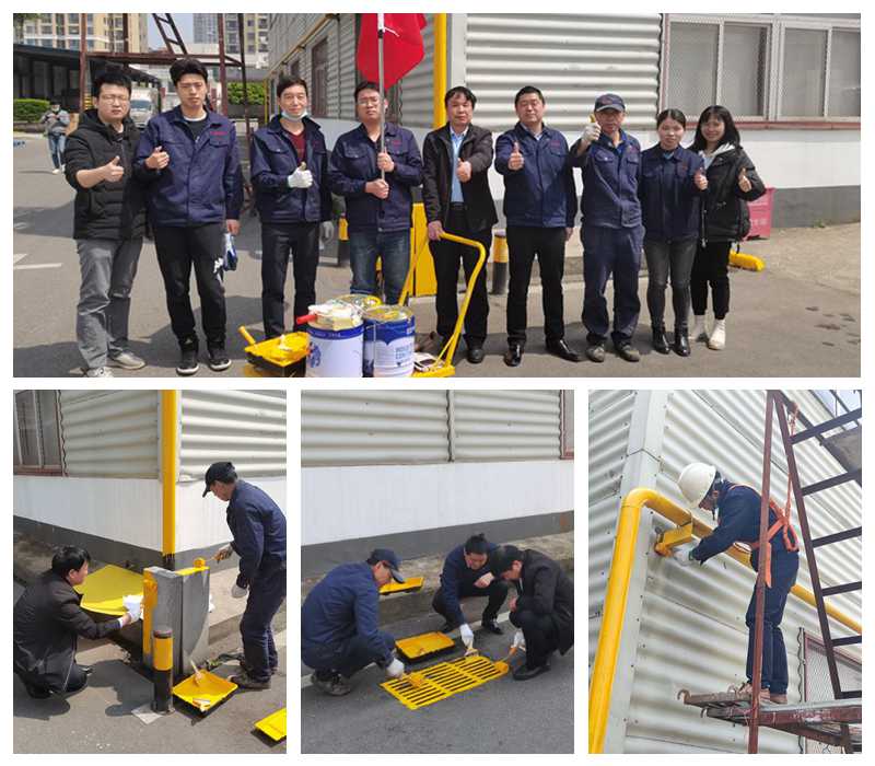 活動中,各黨員、積極分子化身“油漆工”,對武漢廠區(qū)天然氣管道、雨水井蓋及標識進行了重新噴漆。深入基層、服務基層,在做好防護的前提下,大家輕裝上陣,紛紛投入井蓋刷漆、登高刷漆、地面防護等作業(yè)任務。經(jīng)過幾個小時的努力,廠區(qū)天然氣管道及雨水井蓋煥然一新,設(shè)施標識更加醒目。