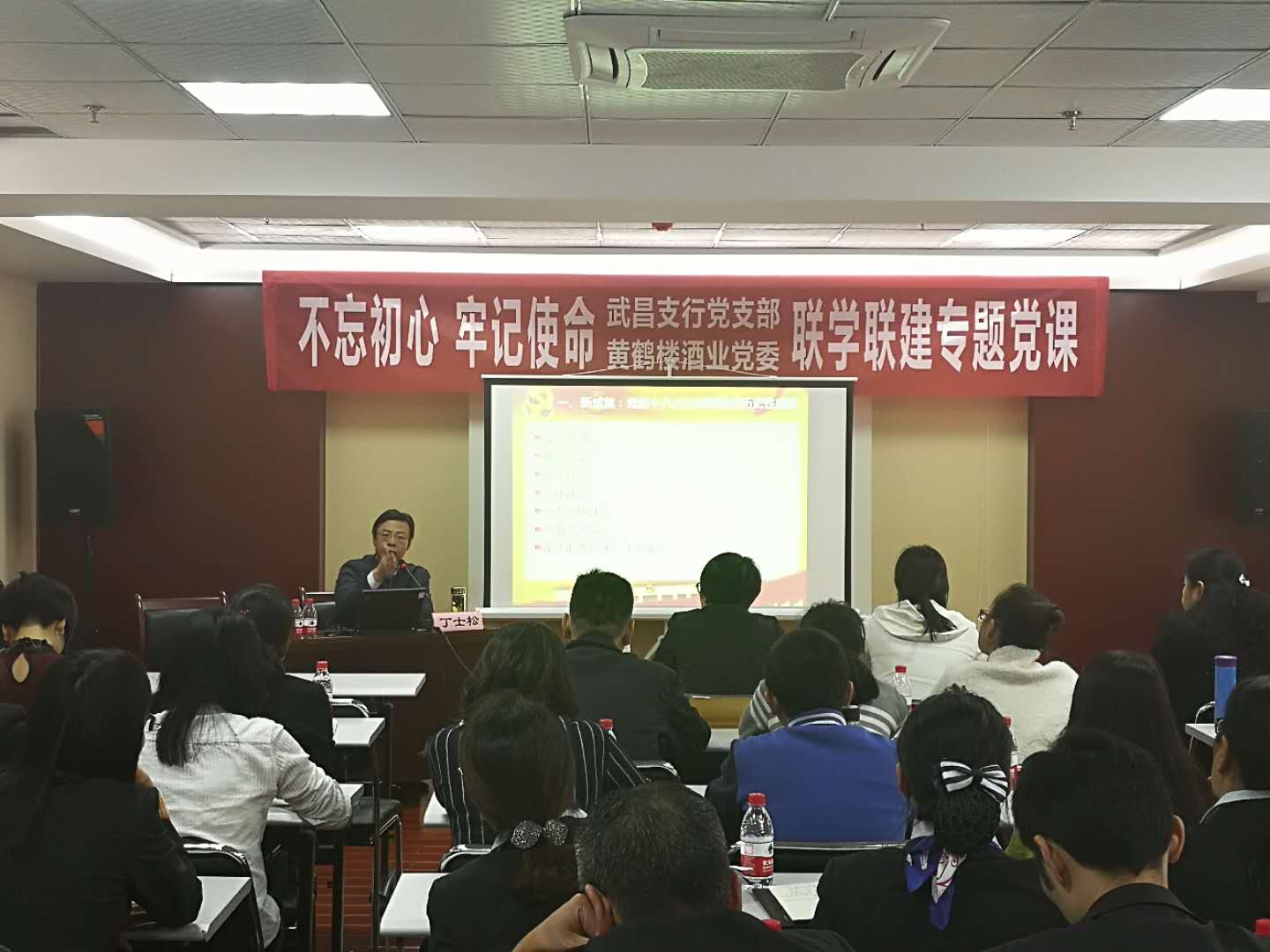 專題黨課上,黃鶴樓酒業的15名黨員同志與武昌支行黨支部黨員同志一起學習了中共武漢市委黨校副校長丁士松同志的黨課——《走進新時代——十九精神解讀》。