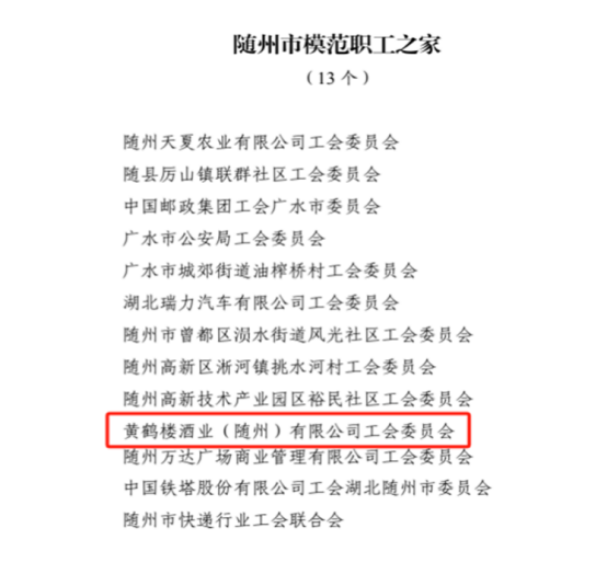 當好職工信賴的娘家人——黃鶴樓酒業(隨州)有限公司工會委員會榮獲2023年度隨州市“模范職工之家”榮譽稱號