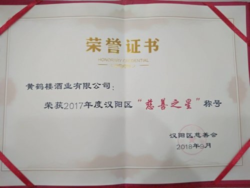 黃鶴樓酒業(yè)榮獲漢陽區(qū)慈善會2017年度“慈善之星”稱號
